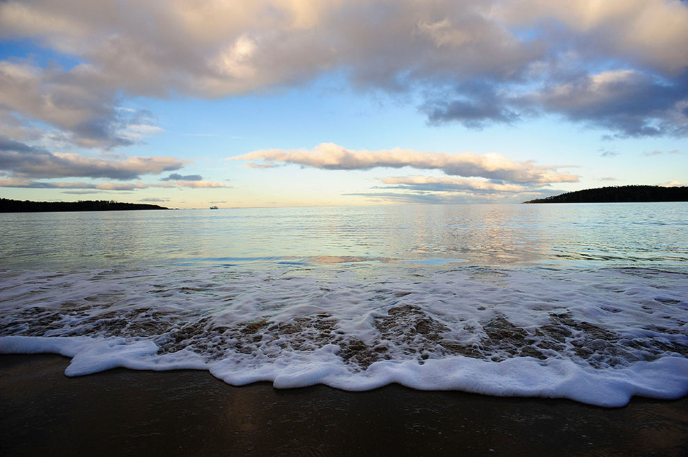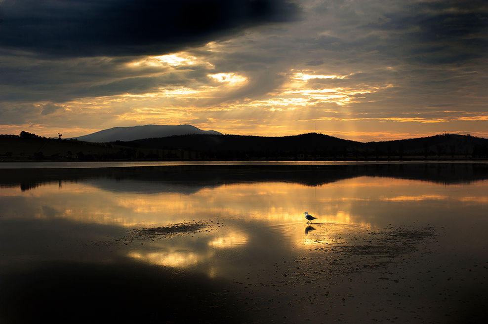 A revitalizing sunrise walk along Kingston Beach Tasmania. Today dog and owner find themselves joined by a companion bird - an ancestor or spirit guide perhaps. A simple harmony of three. In the reflective sublime emptiness they appear like simple characters in a Michael Leunig drawing.